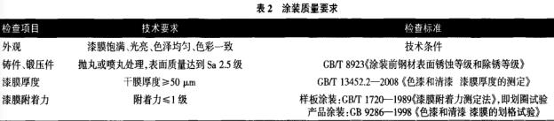 上述工藝流程中,刮膩子將視工件表面狀態(tài)可重復(fù)若干次,直至表面達到平整要求為止。整機涂裝常出現(xiàn)的涂裝缺陷是:流掛、起泡、起皮、附著力差、漆膜韌性差、面漆覆蓋不夠、色澤不一等,采取相應(yīng)措施可排除以上涂裝缺陷。可重點檢查表面預(yù)處理工序、涂料與稀料的配比、涂料的配套、噴涂操作方法及工藝設(shè)備等。整機涂裝質(zhì)量要求見表2。